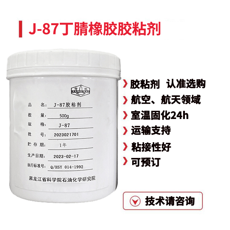 J-87胶粘剂即J-87丁腈橡胶胶粘剂,执行标准Q/HSY 014-1992,是黑龙江省石油化学研究院研发生产的一款胶粘剂。J-87胶粘剂系以丁腈橡胶、酚醛树脂为主体材料的单组分胶粘剂,具有耐介质性能好,干燥速度快、胶液粘度适中,易涂敷等优点,适用于织物、非金属材料与金属材料的粘接。J-87丁腈橡胶胶粘剂已用于直升机主减速器支架的粘接