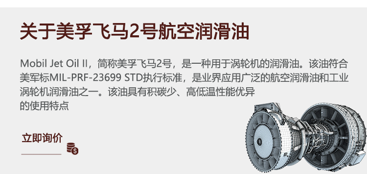 Mobil Jet Oil II,简称美孚飞马2号,是一种用于涡轮机的润滑油。该油符合mei,标MIL-PRF-23699 STD执行标准,是业界应用广泛的航空润滑油和工业涡轮机润滑油之一。该油具有积碳少、高低温性能优异的使用特点。