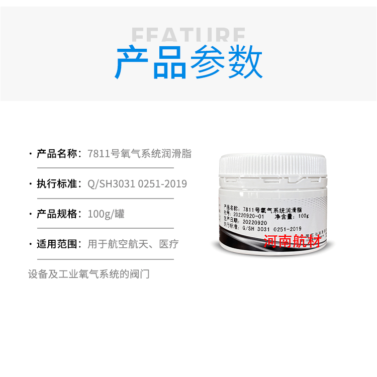 7811号氧气系统润滑脂采用全氟聚醚(PFPE)基础油和特殊稠化剂,具有优异的化学惰性、抗氧化性和抗燃性,能够在纯氧或高氧浓度环境下安全使用,避免因润滑剂引发的燃烧或爆炸风险。