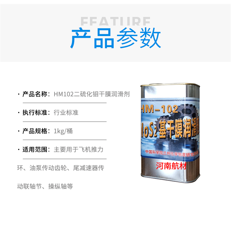 HM-102二硫化钼干膜润滑剂基本组成:MoS2基,有机粘结树脂,改性填料,稀释剂。高温固化,综合性能优良,通用性强,耐油类介质,可对零件进行涂膜加工。适用于一般工况条件下的机械零件表面,起抗磨减摩作用。