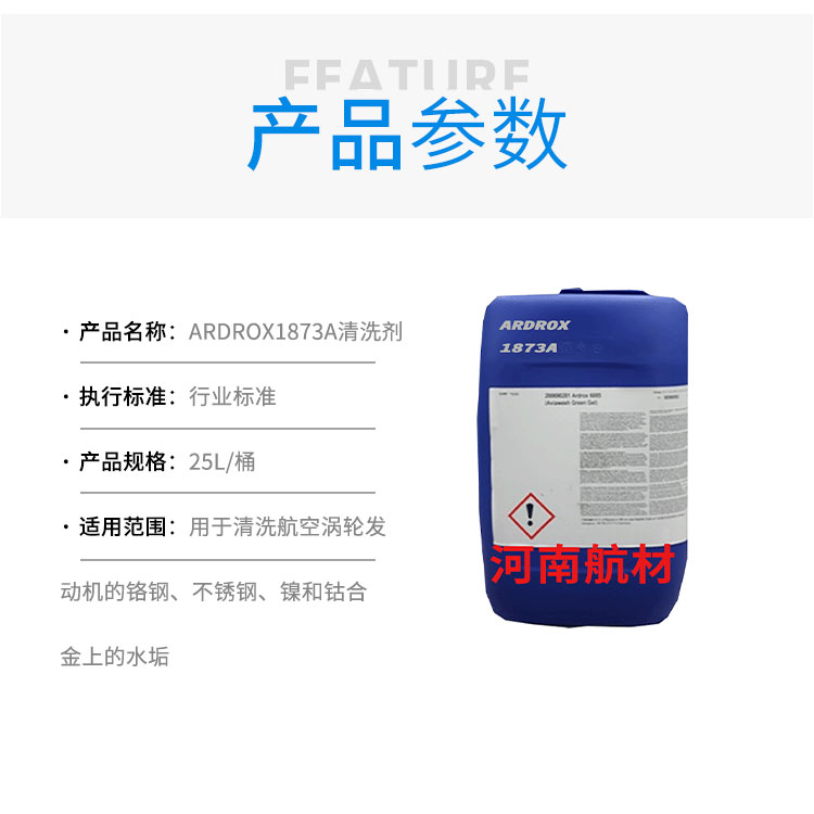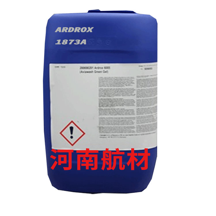 Ardrox1873A 是一种浓缩的液体混合物形态的清洗剂,包含络合剂和表面活性剂。它呈弱酸性。Ardrox 1873A 为去除用于制造航空涡轮发动机的铬钢、不锈钢、镍和钴合金上的水垢而配制。在使用过程中,这些部件会覆盖上坚硬且附着力强的氧化物垢,必须在检修期间将其去除,以便进行渗透检测过程。