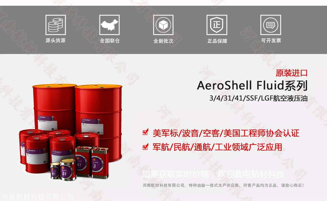 壳牌石油公司生产的的AeroShell Fluid是一个航空液压油的产品系列,包含AeroShell Fluid 3/4/31/41/SSF/LGF等常用型号。从油品组成类别来看,既有矿物型液压油,也有合成烃型液压油;从使用温度来看,既有低温液压油,也有耐燃液压油。 AeroShell Fluid系列产品广泛用于民航、,航和通航领域,同时在民用设备领域也有一定的份额。