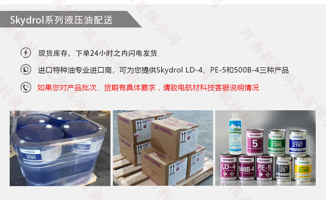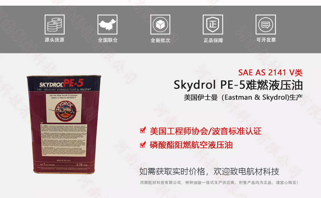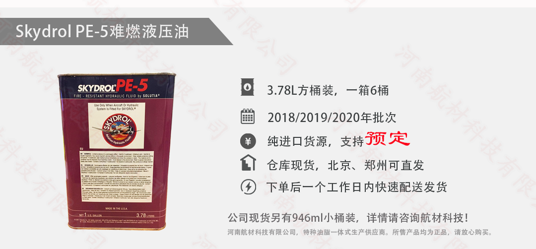 液压系统的安全性对于飞机本身的液压系统而言是比较重要的,因此各大航空油供应商均致力于提升液压油本身的高温性能。首诺英文全称Skydrol,是伊士曼化工的子公司,也是磷酸酯难燃液压油的发明、研发和生产厂家。Skydrol PE-5是其第三代产品,那个性能进一步提升,满足SAE AS 1241 V类执行标准,已经在航空界广泛使用。