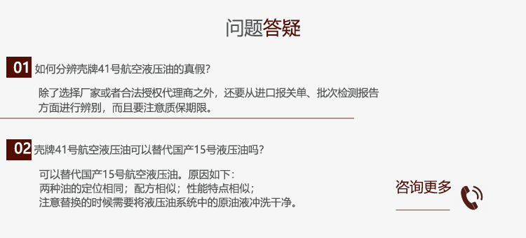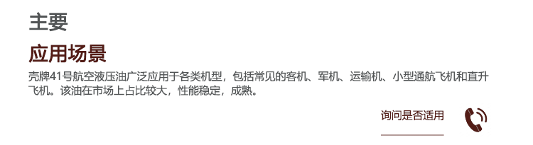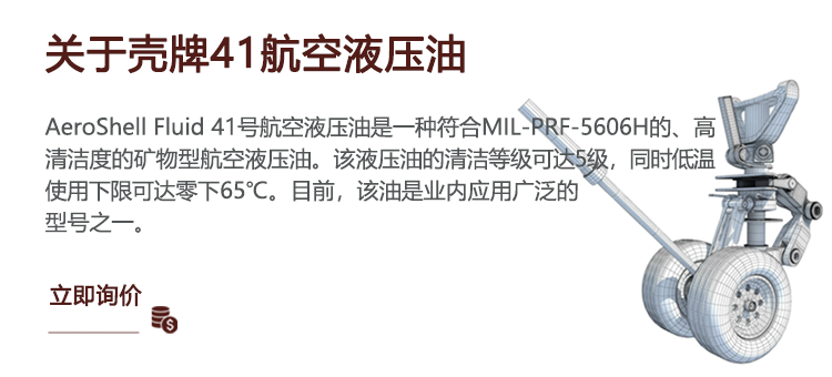 AeroShell Fluid 41号航空液压油是一种符合MIL-PRF-5606H的、高清洁度的矿物型航空液压油。该液压油的清洁等级可达5级,同时低温使用下限可达零下65℃。目前,该油是业内应用广泛的型号之一。