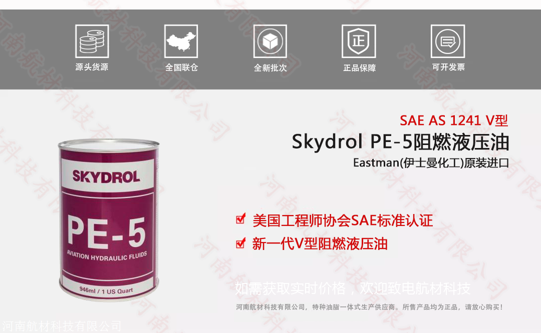 受到行业供需和进口关税的影响,Skydrol PE-5阻燃液压油的价格有小幅度的浮动。如果您需要首诺PE-5航空液压油的实时价格、出厂检测报告和报关单等信息,欢迎致电航材科技!
