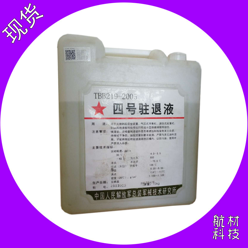 | 四号驻退液基本用途:用于火炮的反后坐装置,气压式平衡机,液压式起重机,57mm高炮液泵和指挥仪变换器液箱等部位。 研制及生产单位:四号驻退液由中国人民总装,械技术研究所研制。 包装:四号驻退液包装:采用10kg桶包装。 贮存:应在清洁、干燥处贮存,避免阳光直射。启用后应及时将容器封严,防止杂质进入和吸潮。