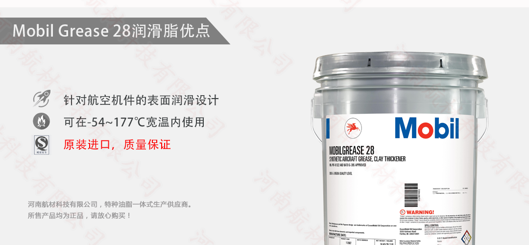 美孚28号(Mobil Grease 28)航空润滑脂是一种宽温脂,有着优异的稳定性、润滑性和较长的使用寿命,符合MIL-PRF-81322G执行标准,被,、民领域的飞机机件广泛使用。