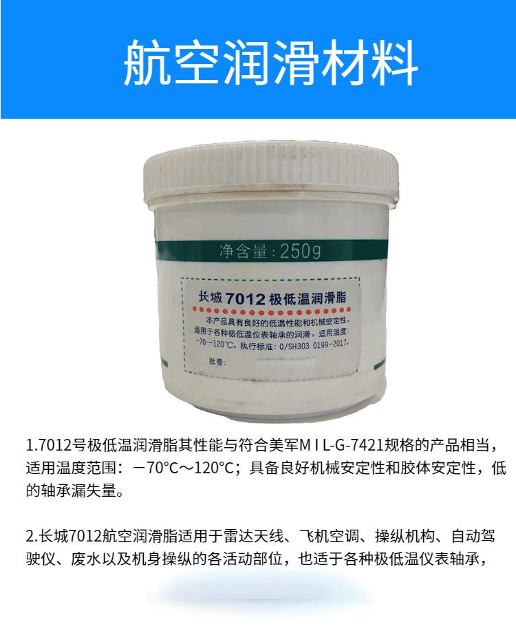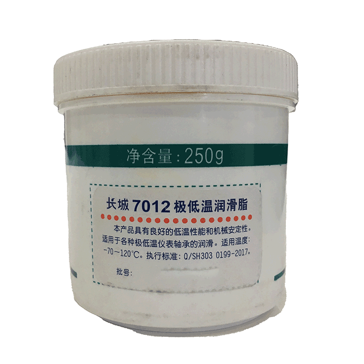 1.7012号极低温润滑脂其性能与符合M I L-G-7421规格的产品相当,适用温度范围:-70℃~120℃;具备良好机械安定性和胶体安定性,低的轴承漏失量。