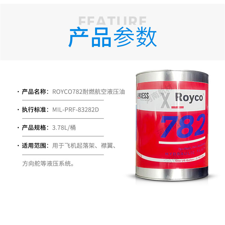 782耐燃航空液压油(Royco 782)是一款高性能合成型航空液压油,由美国罗伊科(ROYCO)公司生产,现归属德国朗盛集团(Lanxess)旗下。其符合 MIL-PRF-83282D,为高温、高压及高安全性要求的航空液压系统设计,具备阻燃性、抗氧化性和极端温度适应性,广泛应用于军民用飞机、工业设备等领域。