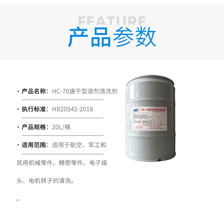 HC-70速干型溶剂清洗剂是一种高效、安全的清洗剂,适用于航空工业设备的清洗。该产品符合HB20542-2018标准,具有良好的低温稳定性和快速干燥特性。