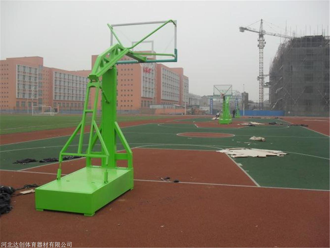 确定好后进行挖坑工作。预备好浇注的混凝土,标号C20以上,下预埋件时留意单孔朝前,放到坑内,两边都放好后再次测量间隔是否符合29.6米的尺寸,如确认无误便可以开始浇注,留意预埋件的水平度。完事用平抹把预埋件周边的水泥抹平,应与地面的高度平行。干燥期,室外温度零摄氏度以上干燥期为3-5天,零摄氏度以下5-8天,干燥后进行架子的安装。安装场地附近干净利索,尽量减少职员和车辆通行,安装时应小心谨严,以免伤人,带箱体的篮球架安装顺序,箱体、立柱、探臂、后拉杆、篮板、篮筐、上拉杆、下拉杆、加配重。钢化玻璃篮板安装时五个连接点要在一个平面上,五点受力要平均;探臂、篮球板、篮球圈要成一线。江苏圆管篮球架青少年篮球架厂家