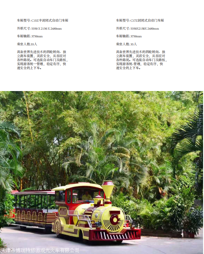 是一家集科研、生产、销售、服务为一体的综合企业,专注于 观光车、观光列车、轨道观光列车、无轨观光列车、森林蒸汽小火车 ,商场迷你小火车的研发生产及销售服务。面对市场需求,天津市博瑞特的产品不断扩大,不断的创新,不断引进先进技术,人才和管理经验,已拥有了一支充满实力的研发人员和管理人员队伍。咨询观光车报价格,买柴油观光车,电动观光车到观光车厂家尽在天津博瑞特旅游观光火车有限公司。目前,本公司制造广泛应用商业地产、欢乐谷、各个旅游景区、、楼盘、社区、展览会议、大型企业、文化景点等场合,好的产品质量、诚信周到的售后服务,使公司深受广大客户信赖和喜欢。,欢迎到厂参观考察,欢迎咨询。