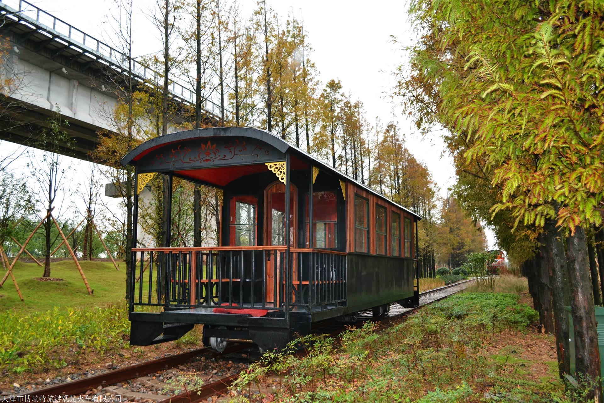 本公司自行开发的内燃旅游观光列车,采用仿古蒸汽火车造型的外观设计,内燃机为动力源,属于牵引多节车厢的、一同运行的非公路用旅游观光列车。