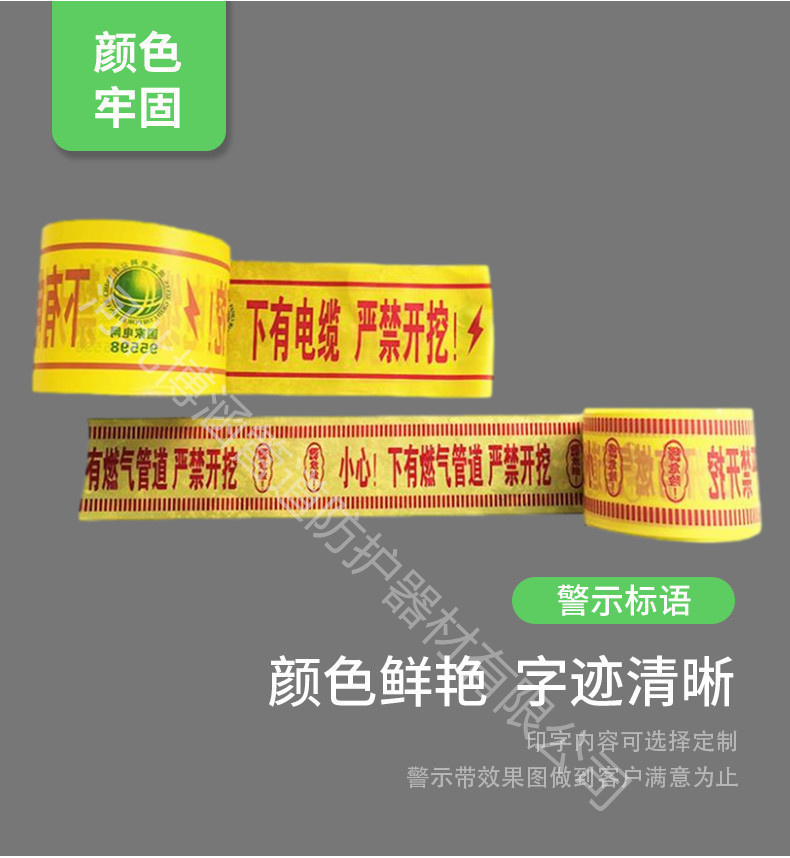 产品描述:警示带是以塑料薄膜为基材,具有良好的绝缘、耐寒、耐电压、耐酸碱、耐溶剂等特性。它耐磨、耐腐蚀、耐油性佳,用于地面警告区域标示,颜色有红、黄、蓝、绿、白、黑、黄与黑、绿与白、红与白供参考,适应不同的需求。ID地埋电子标签