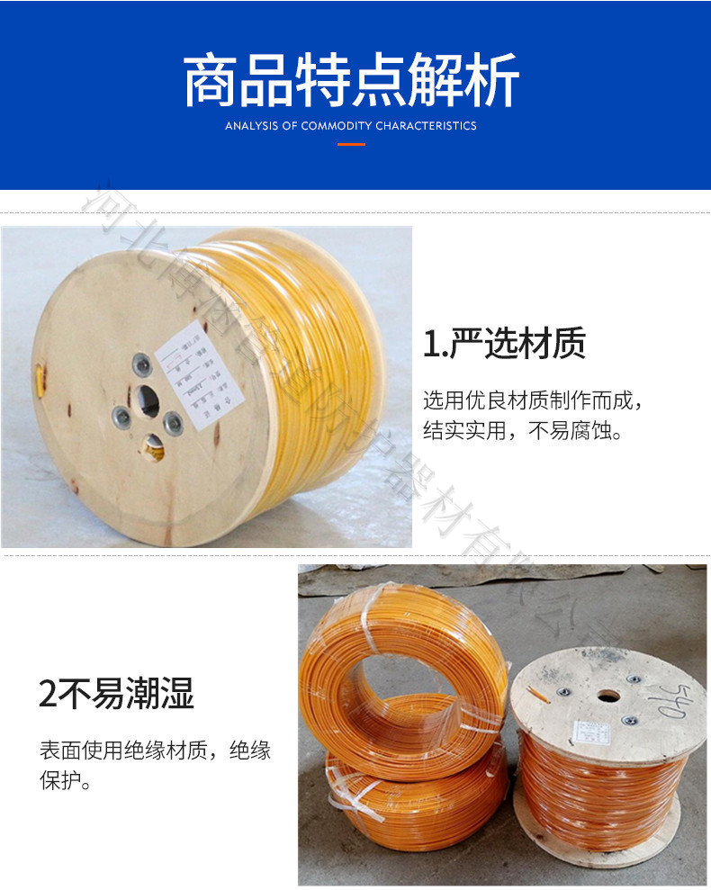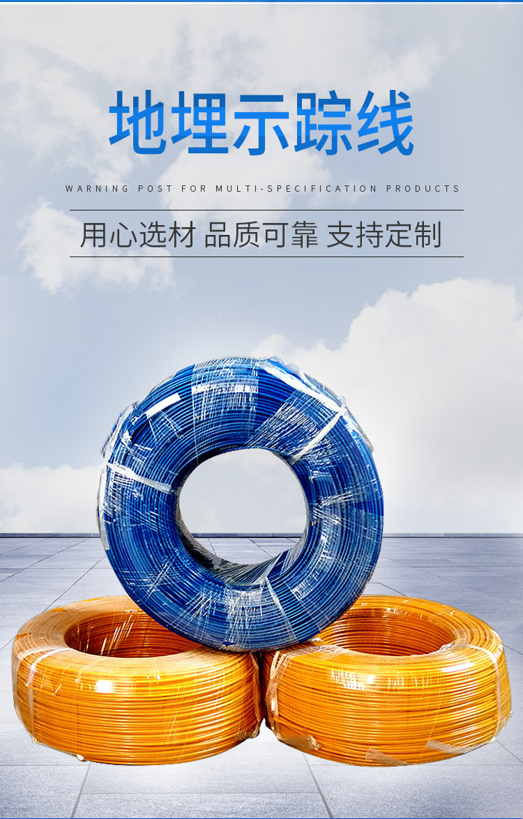 河北博涵管道致力于示踪线事业的发展!选示踪线到河北博涵!以上产品详情请与我公司联系! 商品规格】单线双线 一、产品材质介绍1、PE外层、铜包钢合金线; 2、铜:镀铜; 3、钢:高强度低碳钢;4、PE:聚乙烯PE材料作为防腐保护层。 PE外保护层,绝缘、防腐、防水铜层,增强导电性,提高电信号钢芯,增强线体强度二、生产标准:依据GB1206三、产品使用:专为查找与定位地下非金属管线而设计的产品。它有效地解决了非金属管线不能用金属管线寻管仪探查的问题,可广泛适用于燃气、供水管线管线及排水管线等地下非金属管网的查找与定位,同时可以解决非开挖穿越管道的示踪线安装(不易产生断裂)。四、产品特性 PE防腐保护层:防水、绝缘、防腐、与燃气管道使用寿命相同; 4平方、6平方可用于非开挖管道穿越使用。五、接口处理1、专用连接夹固定;2、选用PE材料制作,专用防腐、防水保护示踪线接头。六、包装:整体线轴捆扎,坚固耐用、便于施工及存放。