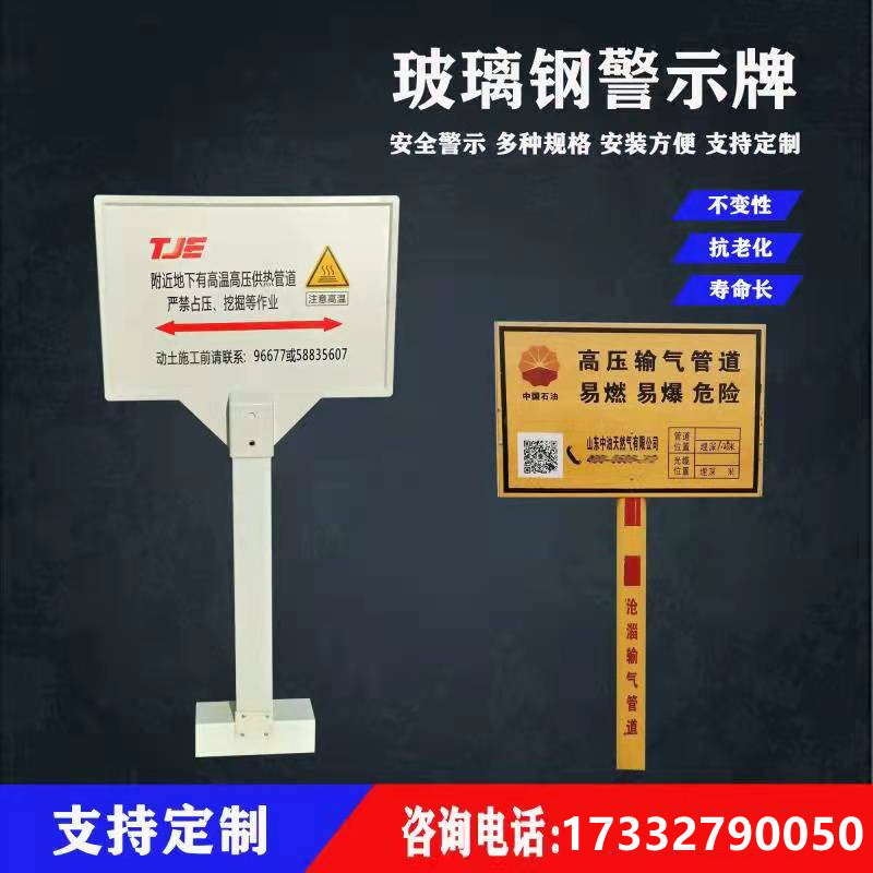 玻璃钢标志牌:经高温压制而成。抗冲击,耐磨损,耐高温,耐腐蚀,适合各种酸碱土壤。使用寿命长达30年。内容采用丝网印刷技术,警示效果好,不需要维护。重量轻,便于运输安装。警示牌有交通警示牌、电力警示牌等多种类型,材料采用玻璃钢,因玻璃钢材料无回收价值,也叫做防盗标志牌。道路交通标志牌是用文字与图案传递警告禁令指示信息给司机和行人,用以管理道路交通的安全设施。它给道路使用者以确切的道路交通信息,使道路安全畅通,事关司机和行人的生命财产安全,是一种不可缺少的交通安全 销售热线:
