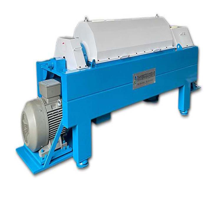 卧式螺旋卸料离心机主要由高转速的转鼓、与转鼓转向相同且转速比转鼓略高或略低的螺旋和差速器等部件组成。当要分离的悬浮液进入离心机转鼓后,高速旋转的转鼓产生强大的离心力把比液相密度大的固相颗粒沉降到转鼓内壁,由于螺旋和转鼓的转速不同,二者存在有相对运动(即转速差),利用螺旋和转鼓的相对运动把沉积在转鼓内壁的固相推向转鼓小端出口处排出,分离后的清液从离心机另一端排出。差速器(齿轮箱)的作用是使转鼓和螺旋之间形成一定的转速差。