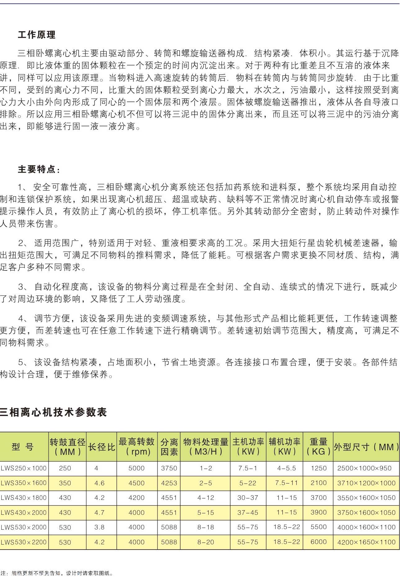 转鼓转速、螺旋推料器差转速、在线可调向心泵装置、有效流体分离液池深度根据排液口液流板调节。