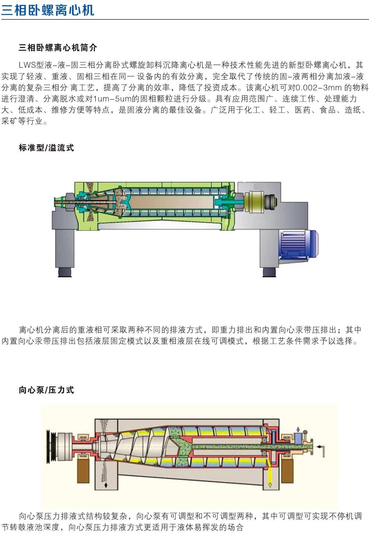 三相卧螺离心机主要由驱动部分、转筒和螺旋输送器构成。结构紧凑,体积小。当要分离的物料由进料泵输送到离心机转鼓内,高速旋转的转鼓产生强大的离心力把比液相重的固相颗粒沉降到转鼓内壁,由于螺旋和转鼓的转速不同,二者存在有相对运动(即转速差,可调),密度大的固体(渣)沉降到转鼓壁上。两相密度不同的清液形成同心圆柱,较轻的液相处于内层,较重的液相处于外层。