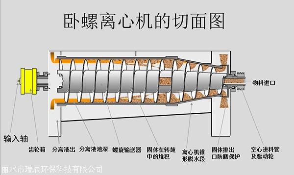 卧螺离心机的转鼓与螺旋输送器启动到全速后,由于旋转产生一个强大的离心力场,悬浮液物料由进料管加入螺旋内,物料通过螺旋筒体内的出料孔进入转鼓,在离心力场的作用下,比重较大的固相物料沉附到转鼓壁上,形成一个环形的固相层,螺旋输送器在差速器(差速器是保证差转速稳定的装置,共用母线的双变频调速装置,实现了转鼓转速、差转速的无级可调,可以适应流量、浓度的变化,保证良好稳定的分离效果)的作用下,使螺旋与转鼓产生一个恒定的差转速,将脱水后的固相沉渣从圆锥转鼓的小端出渣口推出,而比重轻的澄清液从圆柱端的溢流口溢出,如此连续不断地工作,达到连续分离的目的。