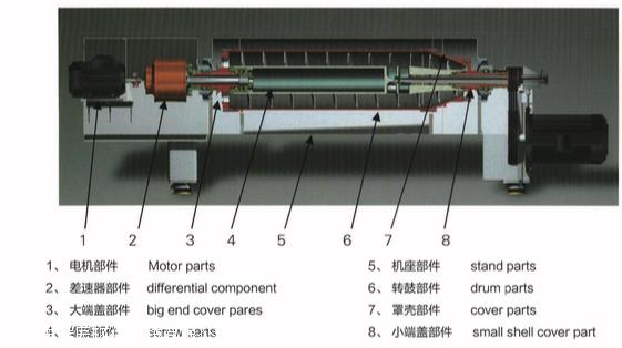 主要由高转速的转鼓、与转鼓转向相同且转速比转鼓略低的带空心转轴的螺旋输送器和差速器等部件组成。当要分离的悬浮液由空心转轴送入转筒后,在高速旋转产生的离心力作用下,立即被甩入转鼓腔内。高速旋转的转鼓产生强大的离心力把比液相密度大的固相颗粒甩贴在转鼓内壁上,形成固体层(因为环状,称为固环层);水分由于密度较小,离心力小,因此只能在固环层内侧形成液体层,称为液环层。由于螺旋和转鼓的转速不同,二者存在有相对运动(即转速差),利用螺旋和转鼓的相对运动把固环层的污泥缓慢地推动到转鼓的锥端,并经过干燥区后,由转鼓圆周分布的出口连续排出;液环层的液体则靠重力由堰口连续\"溢流\"排至转鼓外,形成分离液。