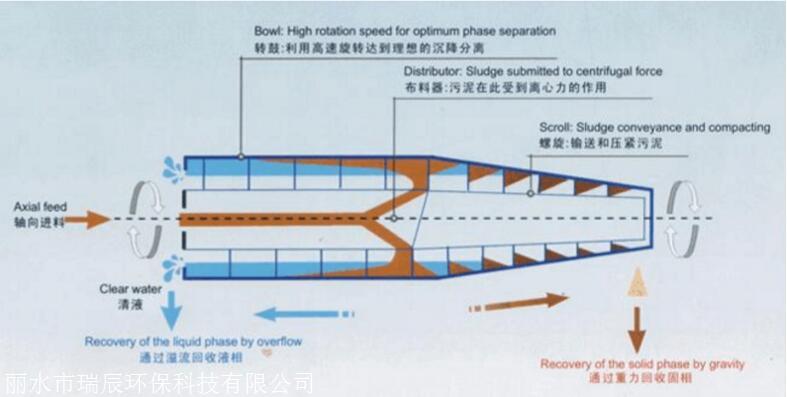 悬浮液从进料管进入转鼓,固相颗粒在离心力场作用下受到离心力的加速沉降至转鼓内壁,沉降的颗粒在螺旋输送器叶片的推动下,从(直筒段)沉降区通过(锥段)干燥区至固相出口排出;经澄清的液相从溢流孔溢出。从而实现固、液相自动、连续的分离。