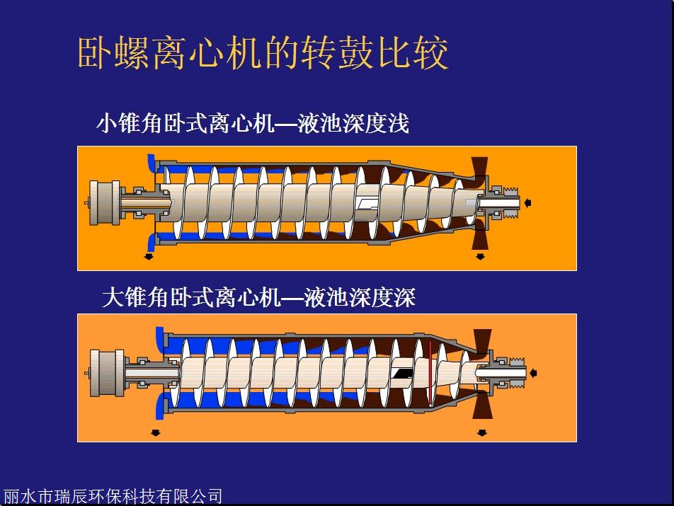 主要由高转速的转鼓、与转鼓转向相同且转速比转鼓略低的带空心转轴的螺旋输送器和差速器等部件组成。当要分离的悬浮液由空心转轴送入转筒后,在高速旋转产生的离心力作用下,立即被甩入转鼓腔内。高速旋转的转鼓产生强大的离心力把比液相密度大的固相颗粒甩贴在转鼓内壁上,形成固体层(因为环状,称为固环层);水分由于密度较小,离心力小,因此只能在固环层内侧形成液体层,称为液环层。由于螺旋和转鼓的转速不同,二者存在有相对运动(即转速差),利用螺旋和转鼓的相对运动把固环层的污泥缓慢地推动到转鼓的锥端,并经过干燥区后,由转鼓圆周分布的出口连续排出;液环层的液体则靠重力由堰口连续\"溢流\"排至转鼓外,形成分离液。
