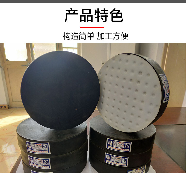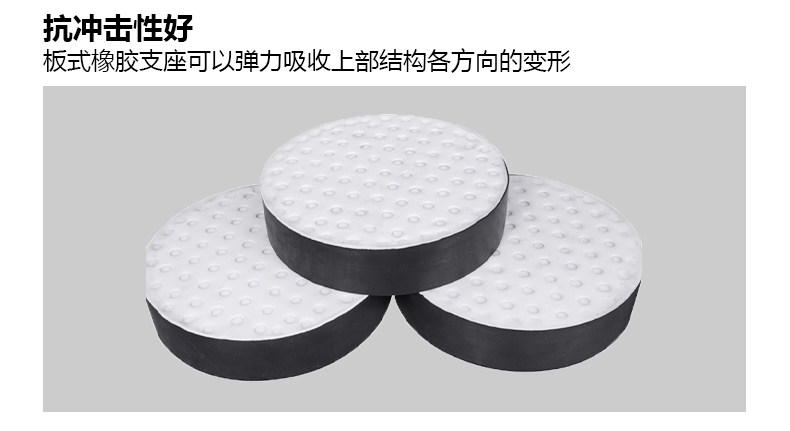 (2)特点:本产品在桥梁建筑、水电工程、房屋抗震设施上已广泛应用,与原用的钢支座相比,有构造 简单,安装方便;节约钢材,价格低廉;养护简便,易于更换等优点,且本品建筑高度低,对桥梁设计与降低造价有益;有良好的隔震作用,可减少活载与地震力对建筑物的冲击作用。