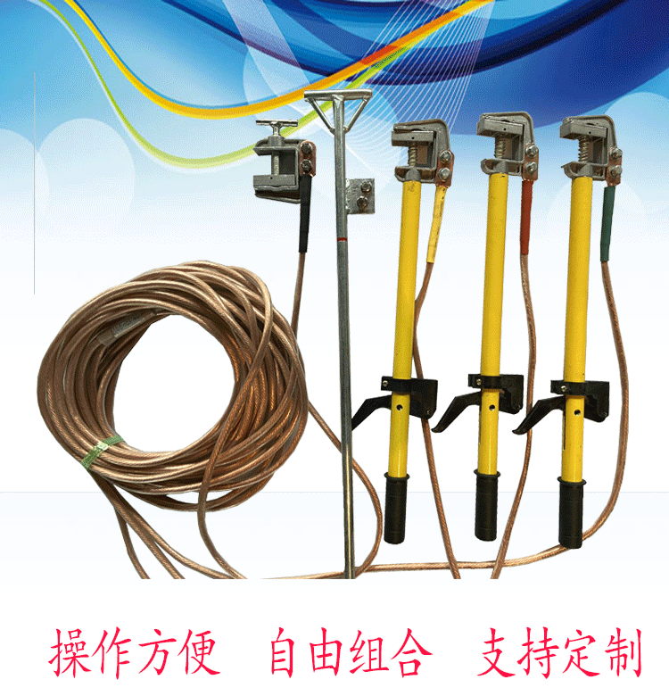 (4)接地软铜线有分相式和组合式,接地棒有平口式和双簧钩式线夹。