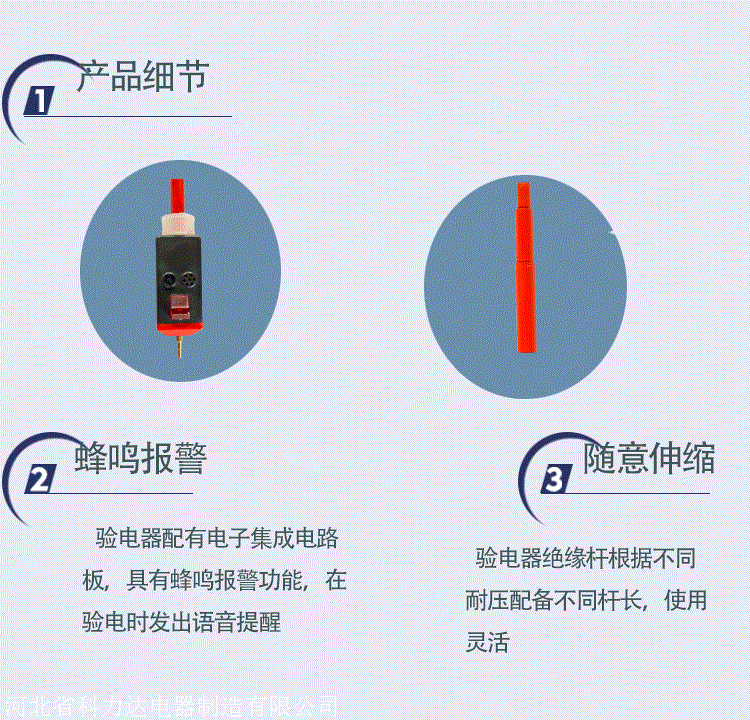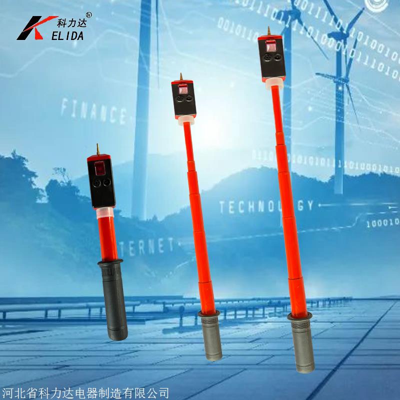 科力达苏式0.4-10KV高低压声光验电器 通过检测流过验电器对地杂散电容中的电流,检验设备、线路是否带电的装置。本品各部分的联接牢固、可靠、指示器密封完好,表面光滑、平整、指示器上的标志完整。绝缘杆表面清洁、光滑。携带方便、验电灵敏度高、不受强电场干扰、具备全电路自检功能、待机时间长等特点。