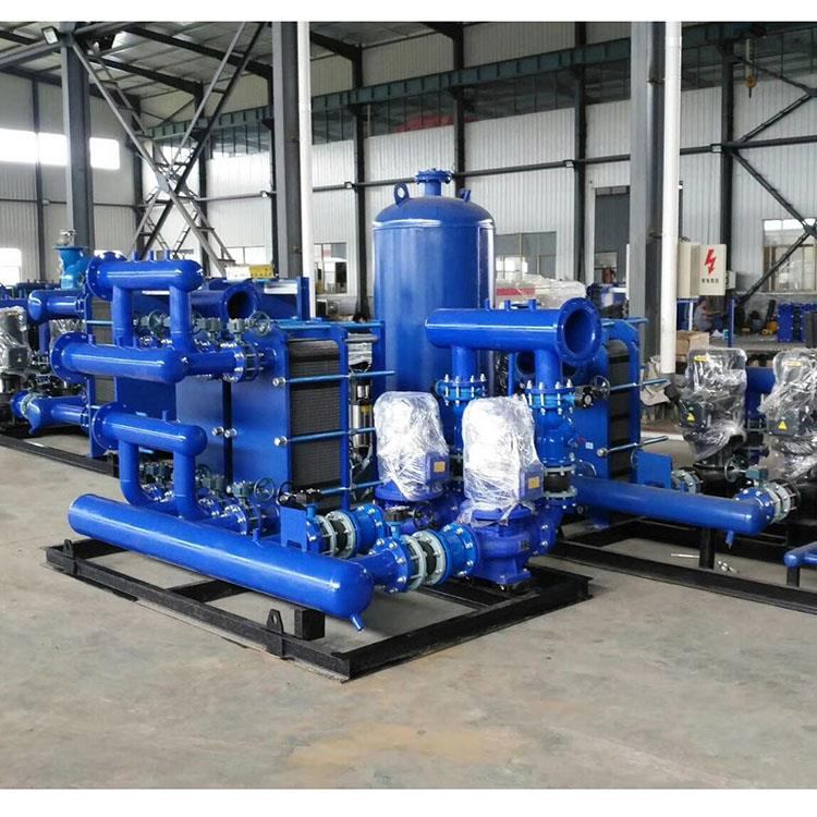 换热机组由板式换热器、智能温控装置、智能电控装置、循环泵、补水泵、稳压膨胀水箱、补(凝)水箱、过滤器、阀门、仪表、传感器、配管底座等组成。