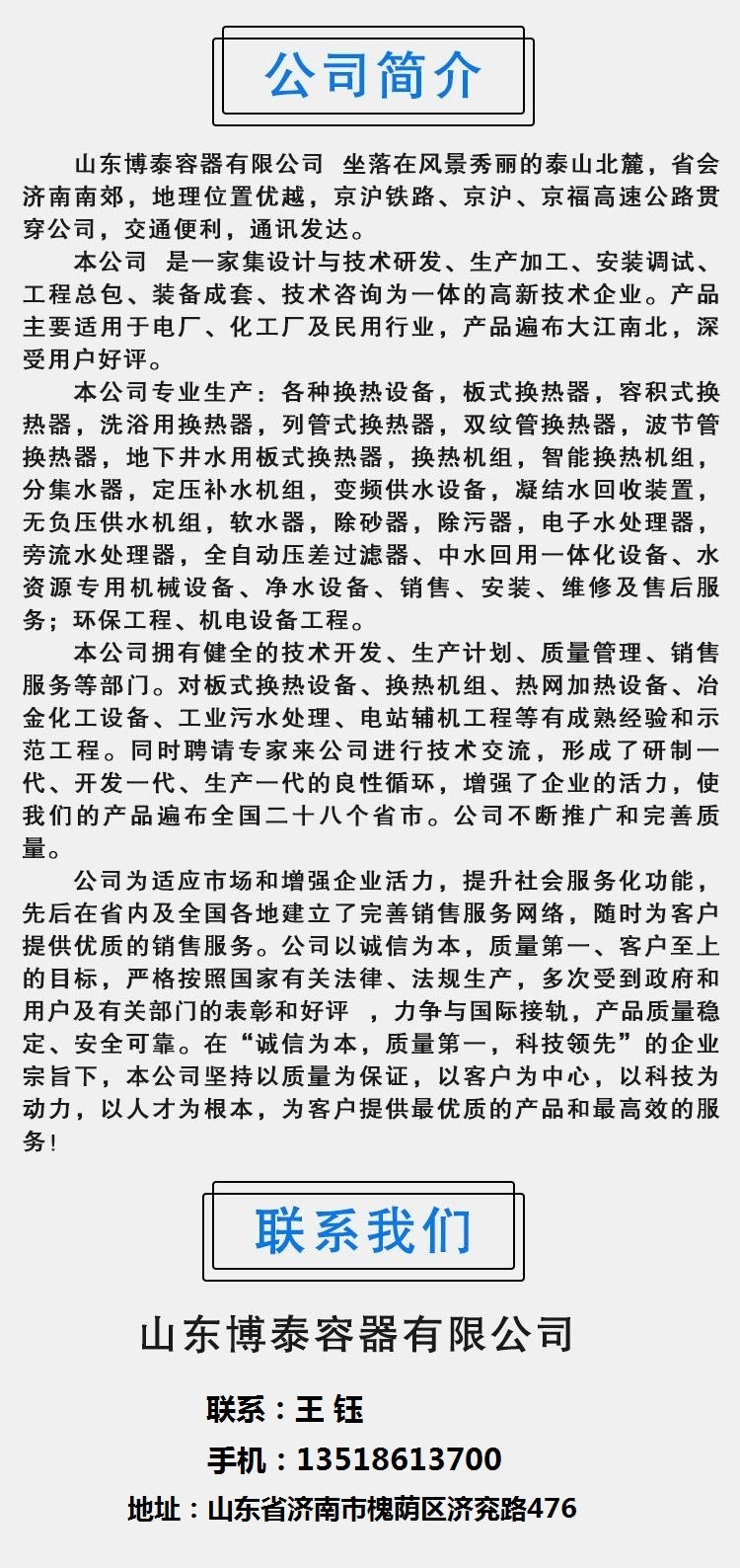 山东博泰容器有限公司是一家集设计与技术研发、生产加工、安装调试、工程总包、装备成套、技术咨询为一体的高新技术企业。产品主要适用于电厂、化工厂及民用行业,产品遍布大江南北,深受用户好评。 本公司生产:各种换热设备,板式换热器,容积式换热器,洗浴用换热器,列管式换热器,双纹管换热器,波节管换热器,地下井水用板式换热器,换热机组,智能换热机组,分集水器,定压补水机组,变频供水设备,凝结水回收装置,无负压供水机组,软水器,除砂器,除污器,电子水处理器,旁流水处理器,全自动压差过滤器、中水回用一体化设备、水资源专用机械设备、净水设备、销售、安装、维修及售后服务;环保工程、机电设备工程。