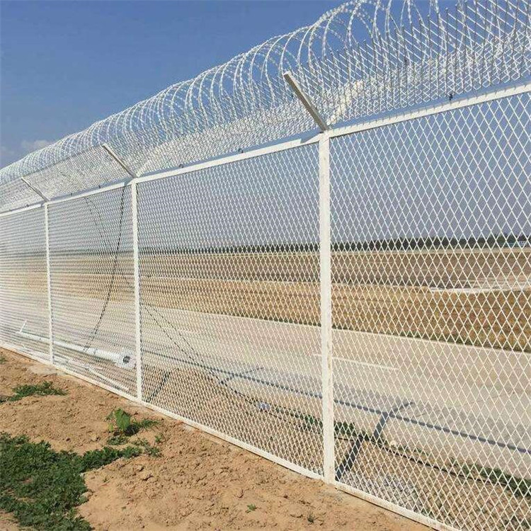 机场围界网的规格:常用高度为2.0m,高度可做2.4m;柱中到柱中的距离一般为3m;折弯的都采用的是顶部30公分30度角的折弯,立柱多采用60*60*3mm方管;网孔 大小通常为50*100mm;塑后丝径范围:5.0-6.5mm。