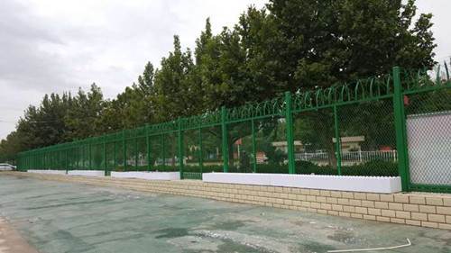 规格:1. 包塑丝经:3.8mm ; 2. 网孔:50mm X 50mm; 3. 尺寸:3000mm X 4000mm; 4. 立柱:60/2.5mm; 5. 横柱:48/2mm; 防腐处理: 电镀、热镀、喷塑、浸塑处。