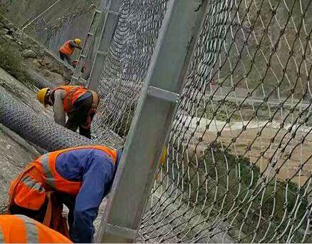 被动防护网是由钢丝绳网、环形网、(需拦截小块落石时附加一层铁丝格栅)、固定系统(锚杆、拉锚绳、基座和支撑绳)减压环和钢柱四个主要部分构成。钢柱和钢丝绳网连接组合构成一个整体,对所防护的区域形成面防护,从而阻止崩塌岩石土体的下坠,起到边坡防护作用。