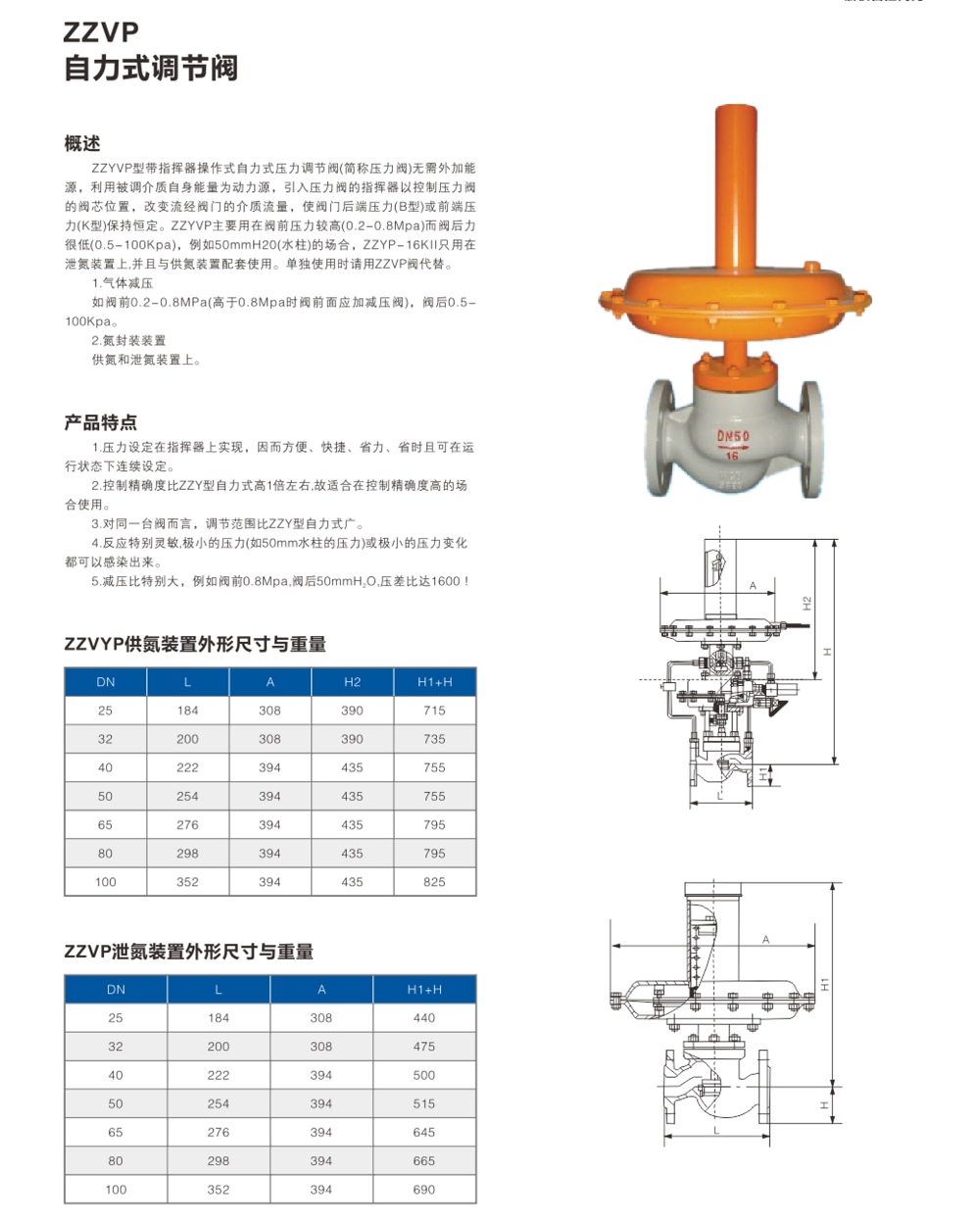ZZC和ZZV自力式差(微)压调节阀是一种不需要外加能源的执行器产品。可用于公称压力PN01,PN10。差(微)压均可分段调节。从50mm.W.C至0.1MPa。其用途十分广泛,可用于工业燃烧炉系统,控制两种物料,如煤气、空气流量配比,以达理想燃烧。用于氢冷发电机组密封油系统,控制密封油与氢气间压力差,以确保可靠密封。当差压阀的低压端通大气即为微压阀(差压阀负压,端压,力为零)