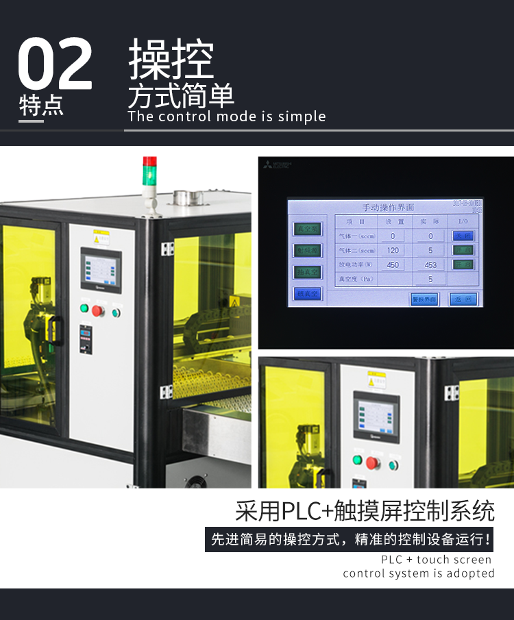 自动式等离子清洗设备,配置运动控制平台,PLC+触摸屏控制方式,采用运动模组,操作简便;