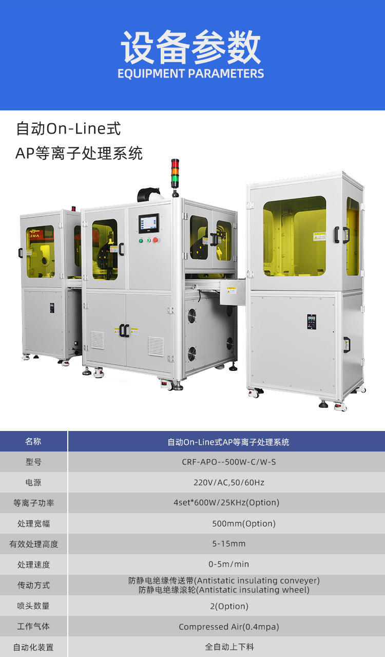 自动On-Line式AP等离子清洗设备主要应用于电子行业的手机壳印刷、涂覆、点胶等前处理,手机屏幕的表面处理;连接器表面清洗;通用行业的丝网印刷、转移印刷前处理等。