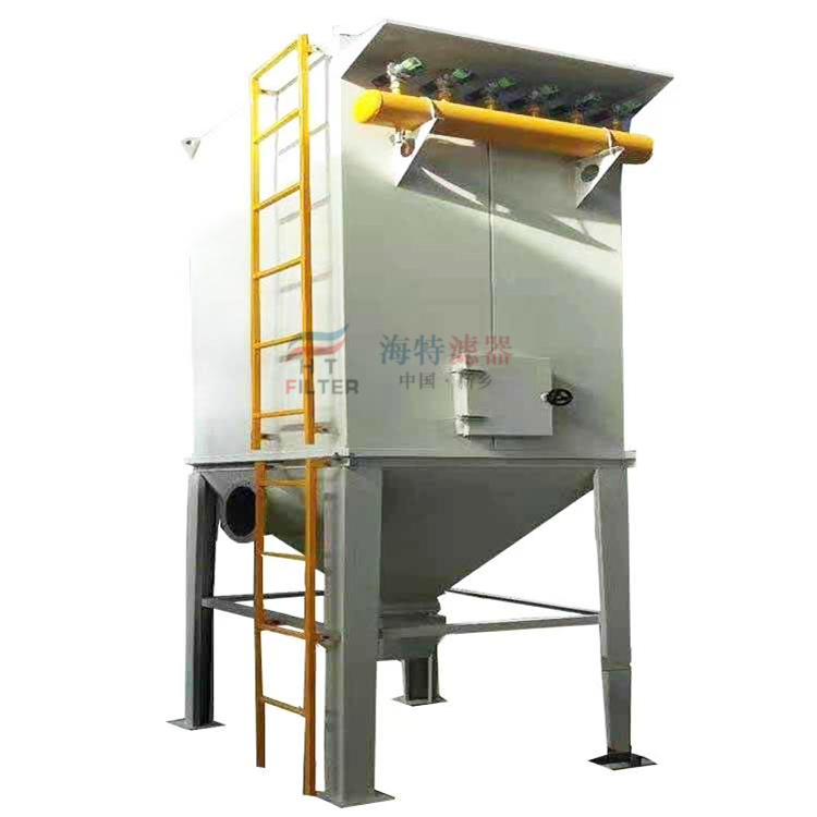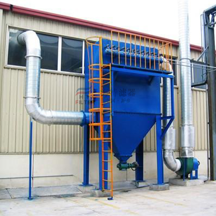 布袋除尘器含尘气体由进气口进入灰斗、或通过敞开法兰口进入滤袋室,含尘气体透过滤袋过滤为净气进入净气室,再经净气排气口,由风机排走。粉尘积附在滤袋的外表面,且不断增加,使滤袋除尘器的阻力不断上升,为使设备阻力不超过1200Pa,袋除尘器能继续工作,需定期清除滤袋上的粉尘。清灰是由程序控制器定时顺序起动脉冲阀,使包内压缩空气(0.5-0.7MPa)由喷吹孔眼喷出(称一次风)通过文氏管诱导数倍于一闪风的周围空气(称二次风)进入滤袋使滤袋在瞬间急剧膨胀,并伴随着气流的反向作用抖落粉尘,达到清灰的目的。