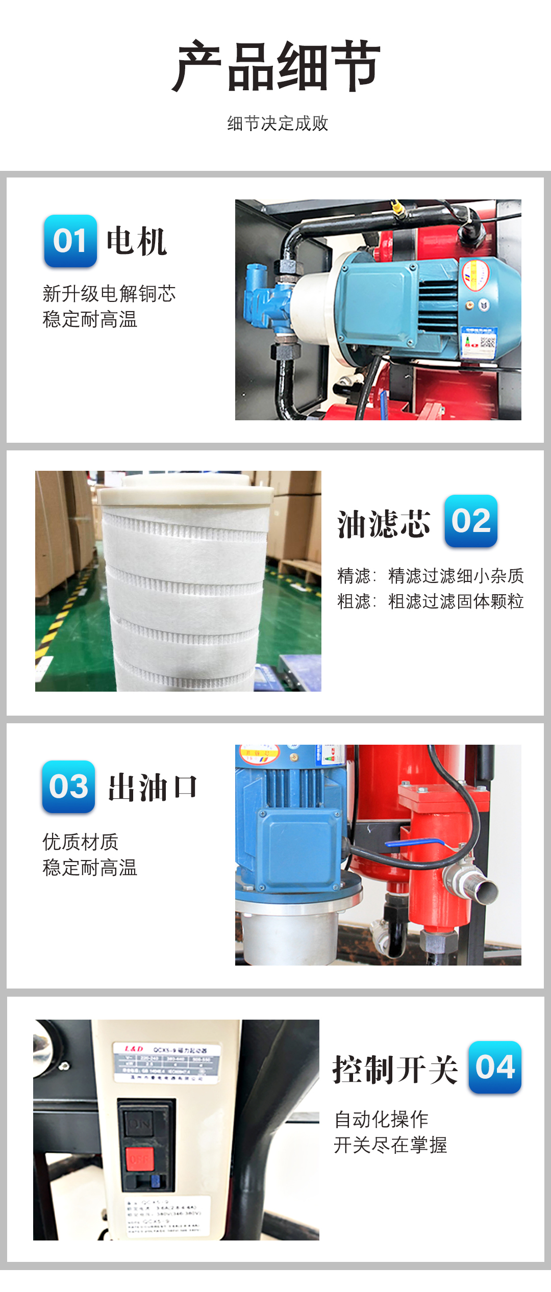 油液在注入系统前必须经过净化,未经净化的新油其污染程度往往超过实际液压规定的要求,即使是刚从油罐中抽取的新油也不适合直接使用。新油在加工、调和和储存过程中都有可能混入各种污染物颗粒、水分等。我公司生产研发的LYC系列高精度滤油机是一种预过滤并为系统注油及净化系统油液的理想设备。