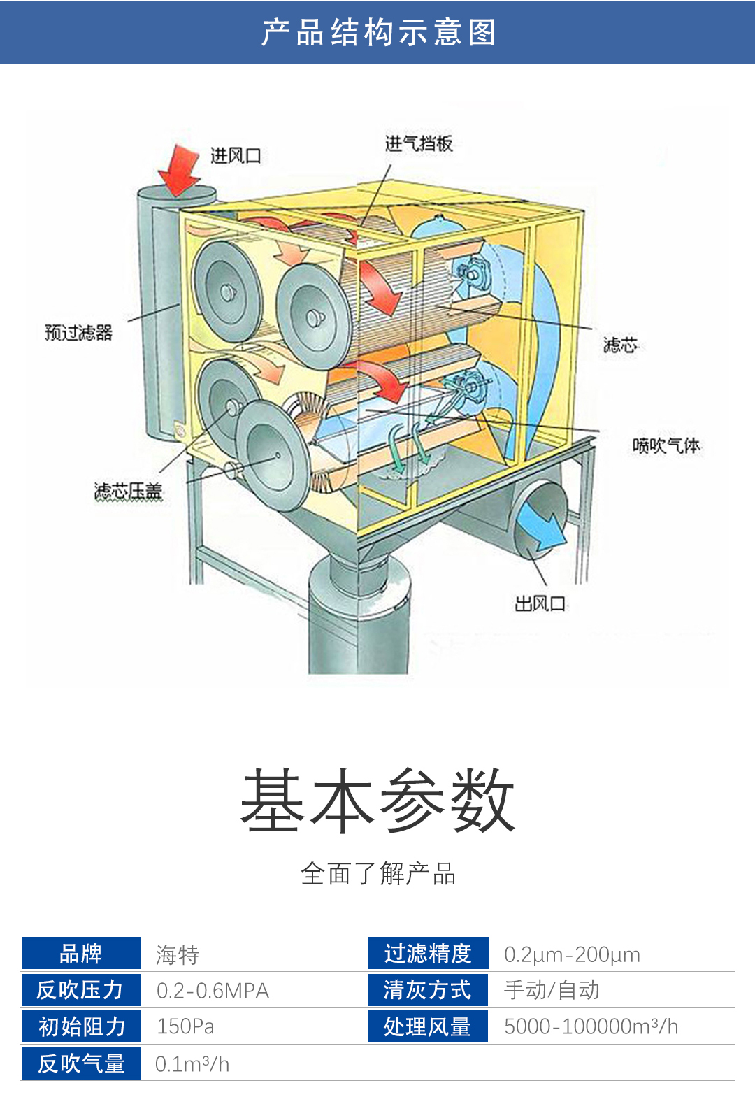 箱体、除尘滤筒、脉冲阀、集灰箱(可调) |