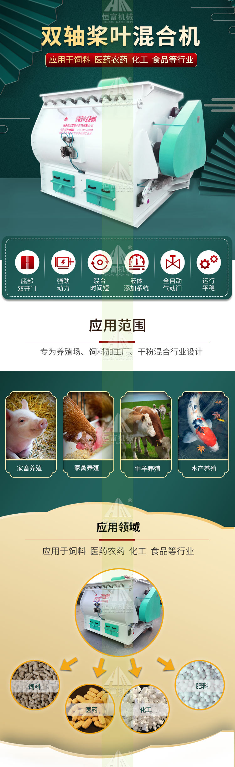 主要产品有:恒富机械大豆玉米上料配件、一体机玉米豆粕上料管、封闭式上料管道、小型饲料粉碎搅拌一体机、锤片式饲料粉碎机、水滴式饲料粉碎机、立式饲料搅拌机、卧式单轴双螺带混合机、卧式单桨叶混合机、卧式双轴桨叶混合机、小型平模饲料颗粒机、环模饲料颗粒机、饲料膨化机、成套饲料加工机组设备、成套草粉颗粒机组、预混饲料加工机组、浓缩饲料加工机组。我们相信:您需要的正是我们能做的!我们真诚希望与国内外友人携手并进,共创美好未来!