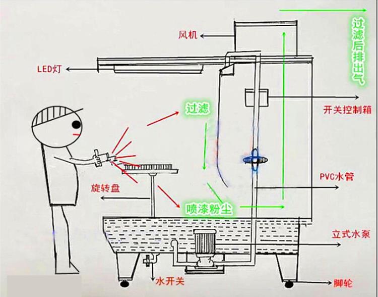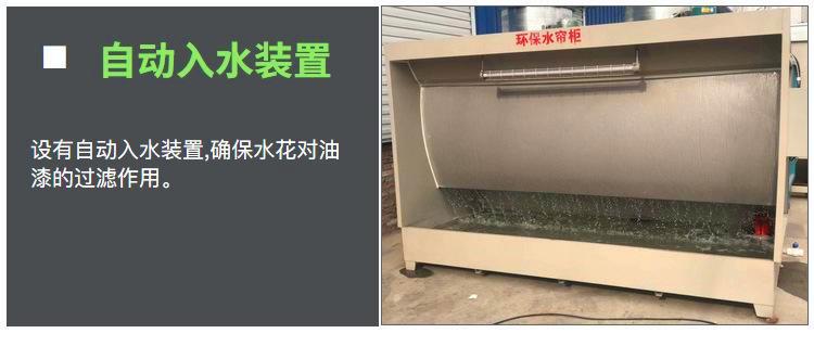 喷油水帘柜,通过管道泵循环将水箱内经过过滤的水抽至上部水槽,由水槽溢流至水帘板形成水帘,并通过离心风机的离心力、将水箱内的水形成涡卷,产生多层水幕,将喷枪在喷漆室涂装工作所飘散的漆雾由吸风引导,冲洗在水里,经漆雾漆净化器之水帘和水雾的冲洗过滤,再经气水分离器挡漆板收集过滤网,从而完成漆雾净化起到环保的作用,又保证了操作人员健康、良好的工作环境。