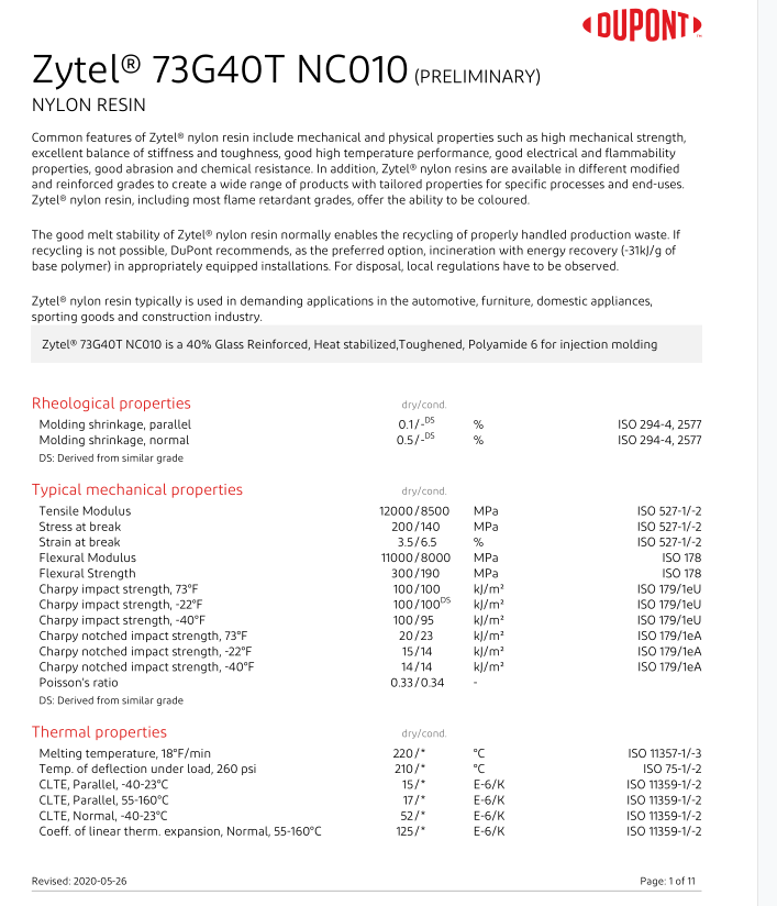 Zytel® 73G40T NC010是一种热稳定玻璃增强PA6,用于注塑成型,玻纤含量40%
