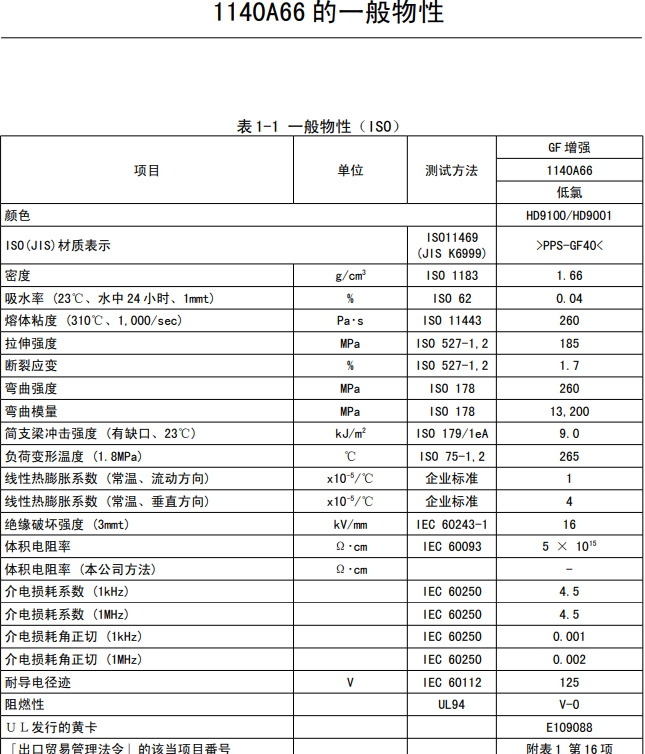 日本宝理PPS塑料1140A66 HD9100|加纤40%本色|低氯耐磨阻燃型|高强度聚苯硫醚物性表: