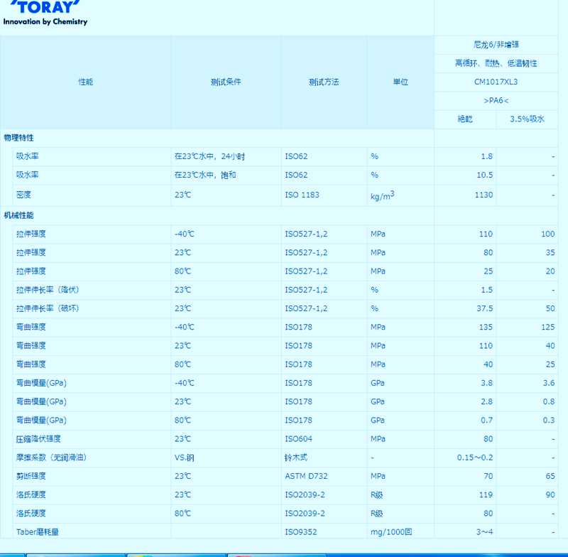 迎新现在销售的日本东丽AMILAN-CM1017XL3是一种非增强聚酰胺6,适用于注塑成型,特点是高循环、耐热、低温韧性佳.主要用在一般生活用品和电子电器开发上的一种尼龙树脂。迎新可提供SGS、MSDS、COA、SDS、原厂物性表供您参考!