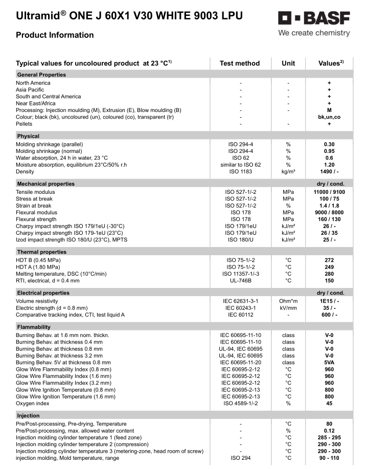 Ultramid®ONE J60X1 V30 WHITE 9003 LPU白色高温尼龙是一种基于非卤化阻燃体系的高温聚酰胺,用30%的玻璃纤维增强,具有出色的防火性能,用于注塑成型。UL94 V0额定值为0.4 mm,具有的热老化性能(150°C电气RTI-相对热老化指数),以及优异的电气性能,包括较高的比较跟踪指数(CTI 0表示600伏及以上)。与传统的高性能塑料相比,本产品具有优越的电气性能。其低腐蚀性保证了加工工具的使用寿命。这种技术适合激光焊接。该产品基于高流动性矩阵,在生产率和设计自由度方面提供了强大的优势。