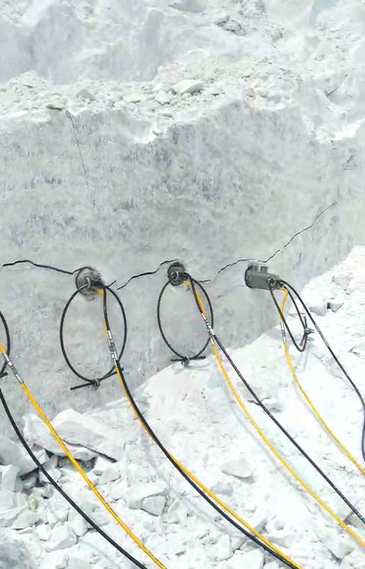劈裂棒原理:通过超高压油泵站(120mp-150)压力输出的高压油驱动油缸产生巨大推动力(2500-3500吨),并推动劈裂棒上的活动活塞向外运动,从而使活塞产生的作用力作用于被分裂体孔壁,岩石在巨大的作用力下按预定方向裂开。