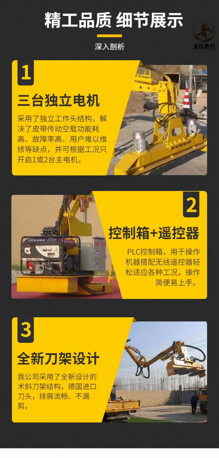 道路绿化树木修剪机是由柴油机或汽油机作为动力的新款树木修剪机,整机结构由底盘、立臂、折臂、修剪刀头、液压组成,其中折臂由液压缸控制,操作安全的电子互锁系统,折臂及立臂起升高度为6m,底盘可作360°旋转,实现多侧修剪作业,修剪刀头可作往复式180°旋转或360°旋转,实现平剪、竖剪、斜剪多角度修剪作业。整机通过操控箱及来控制各个部分,协调完成修剪作业,因而能保证工作人员的作业安全,提高工作效率和作业质量。整机可以安装在拖拉机上,也可以安装于单排或者双排车车厢内实现一机多用,也可搭配其它多种承载装置或附件,只需要更换承载装置就能完成不同的作业,这就提高了机器的利用率。