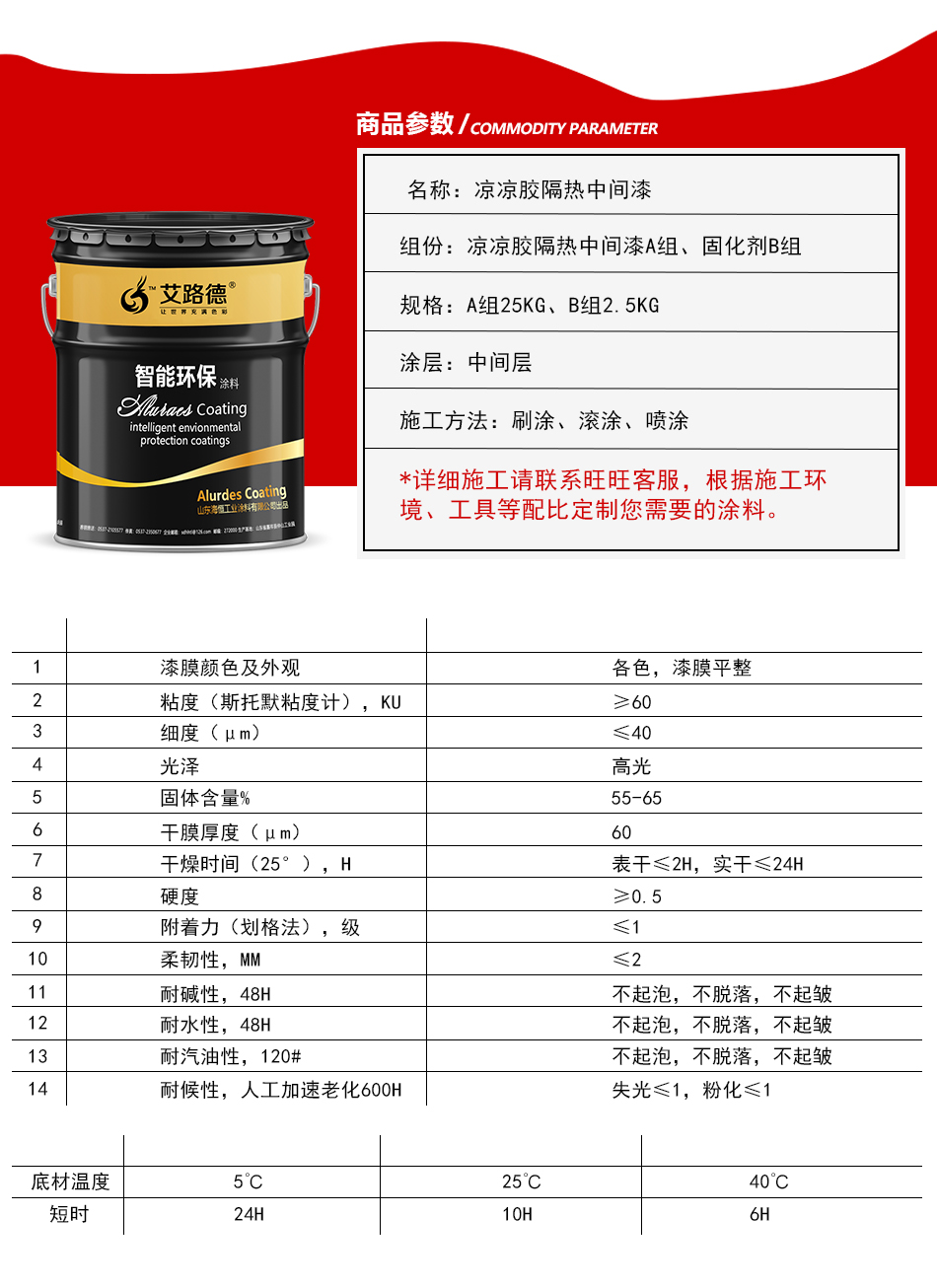 5、稀释剂用量:根据施工情况可适当添加专用稀释剂,用量为5~15%。